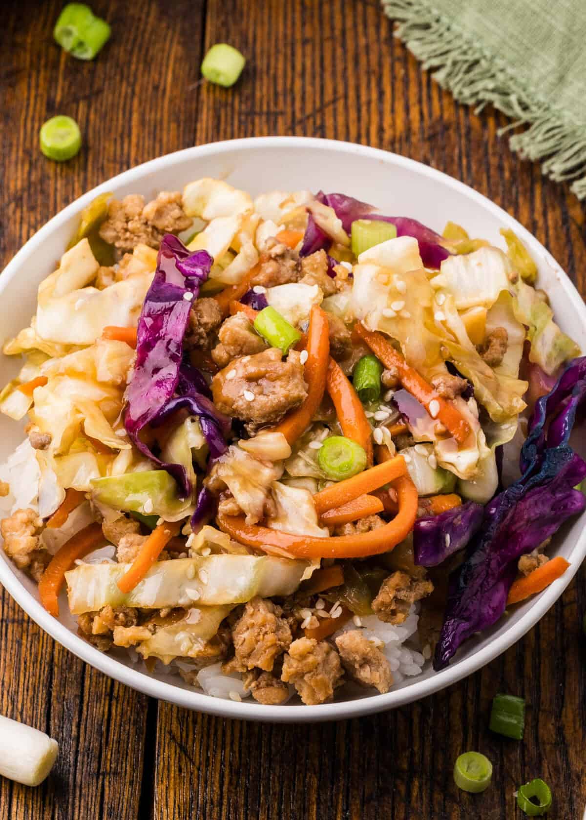 Craving takeout, but want something a little lighter? This Chicken Egg Roll in a bowl is exactly what you are looking for! It has a savory sesame ginger flavor that you find in classic egg rolls. But there is no wrapper or deep fryer involved.